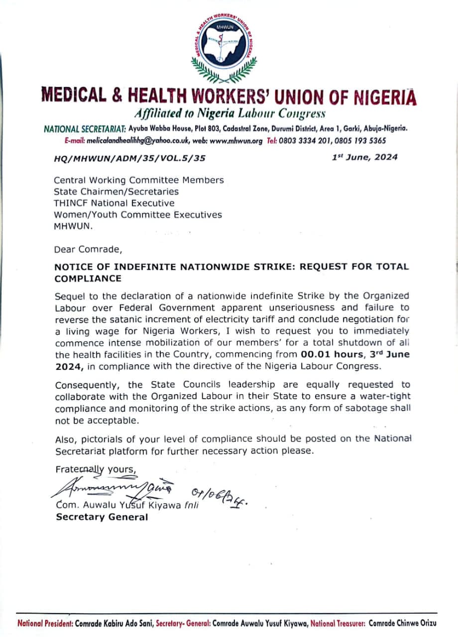 Also, the Medical and Health Workers Union of Nigeria, M&HWUN, in a circular, said: “Sequel to the declaration of a nationwide indefinite strike by the organized labour over federal government’s apparent unseriousness and failure to reverse the satanic increment of electricity tariff and conclude negotiation for a living wage for Nigeria workers, I wish to request you to immediately commence intense mobilization of our members’ for a total shut down of all the health facilities in the country, commencing from 00.01 hours, June 3, 2024, in compliance with the directive of the Nigeria Labour Congress.