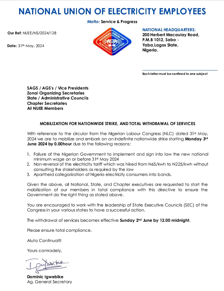Also, the Amalgamated Union of Public Corporations, Civil Service Technical and Recreational Services Employees, AUPCTRE, among others, said: “Your council, committee and organ is hereby directed to mobilize our members to join the nationwide strike that will commence on Monday the 3rd of June, 2024 to press home our demands on the reversal of the hike in Electricity Tariff and the inconclusive National Minimum wage negotiation.”