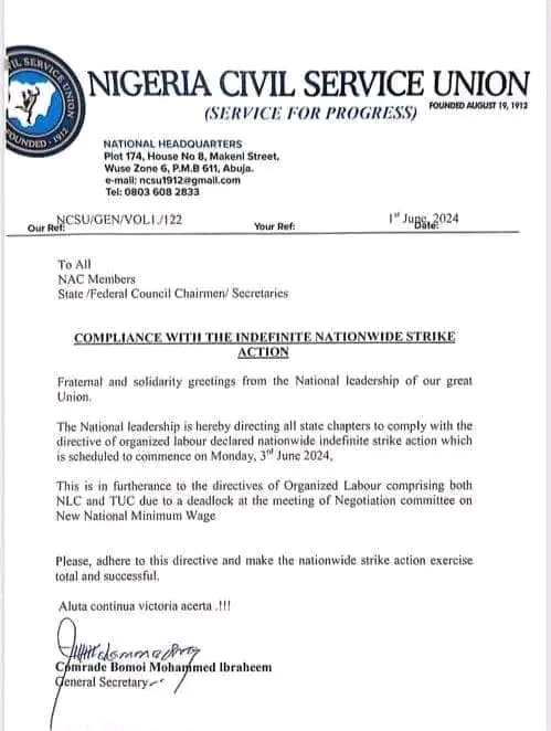 “The national leadership is, hereby, directing all state chapters to comply with the directive of organized labour declared nationwide indefinite strike which is scheduled to commence on Monday, June 3, 2024,